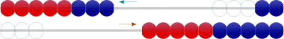 ➋ (➊の形のまま、または赤玉と青玉を少しだけ切り離す)